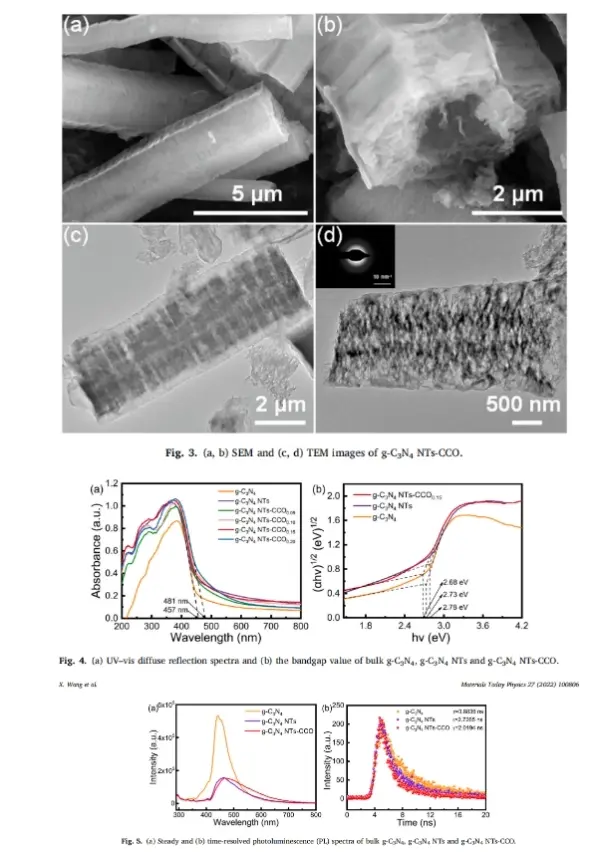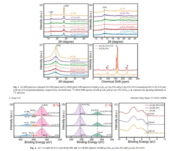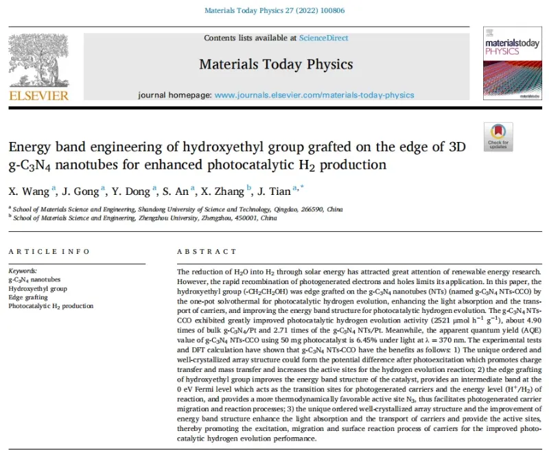 A paper titled “Energy band engineering of hydroxyethyl group grafted on the edge of 3D g-C3N4 nanotubes for enhanced photocatalytic H2 production,” authored by the research group of Prof. Tian Jian, has been published in Materials Today Physics. This journal is classified as a Q1 publication with an Impact Factor of 11.02.